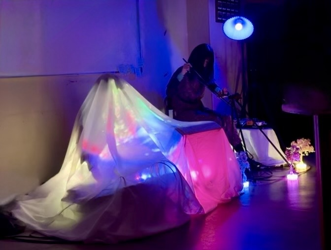 プランク秒の速さで連続的に爆発する「間」の思考。アーティストの身体は思考の写像のように絶え間なく拡張されていく。あるいは拡張を拒み上昇していく。謎の楽器を演奏する四人によるアンサンブル。