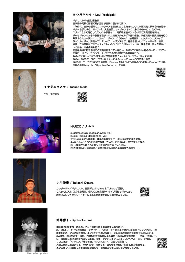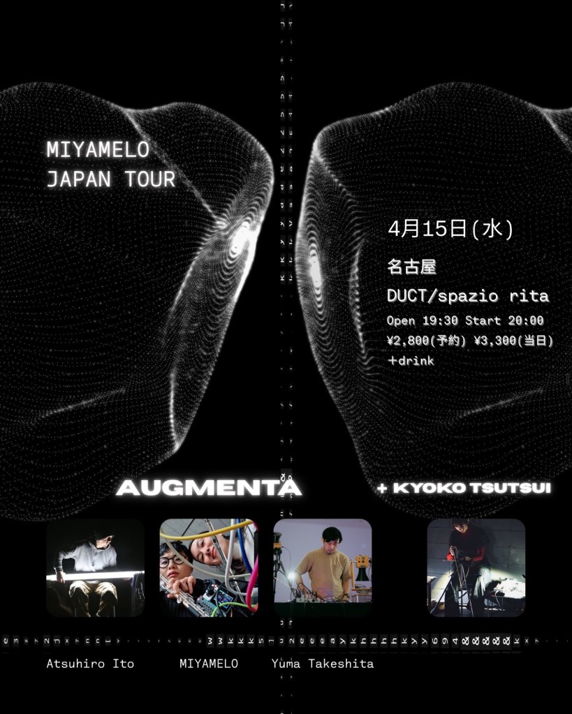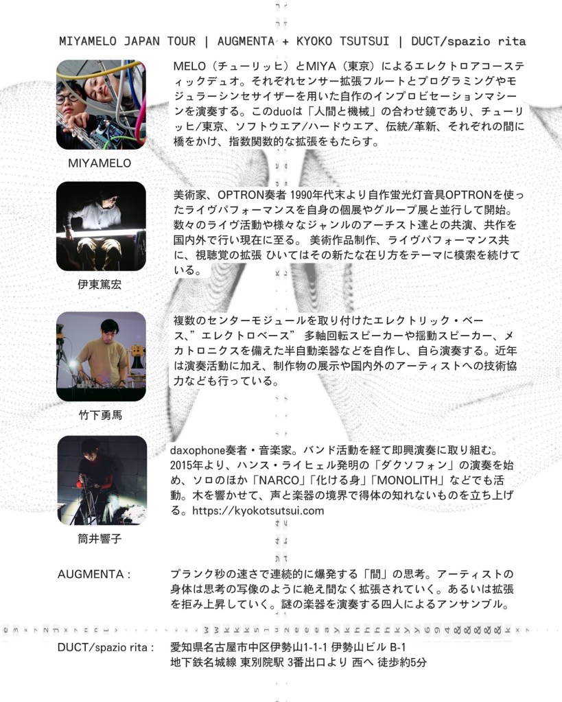 MELO (チューリッヒ)とMIYA(東京)によるエレクトロアコースティックデュオ。それぞれセンサー拡張フルートとプログラミングやモジュラーシンセサイザーを用いた自作のインプロビセーションマシーンを演奏する。このduoは「人間と機械」の合わせ鏡であり、チューリッヒ/東京、ソフトウェア/ハードウェア、伝統/革新、それぞれにの間に橋をかけ、指数関数的な拡張をもたらす。