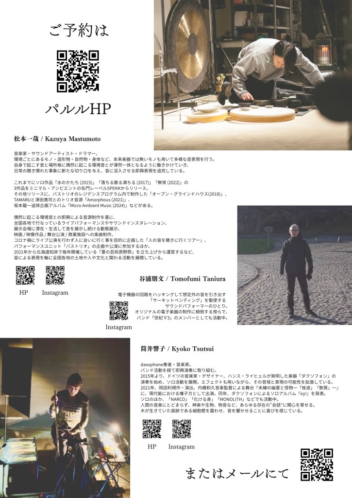 人間の音楽にとどまらず、神楽や生物、物音など、あらゆる存在の“会話”に関心を寄せる。木が生きていた痕跡である細胞壁を震わせ、音を響かせることに喜びを感じている。
